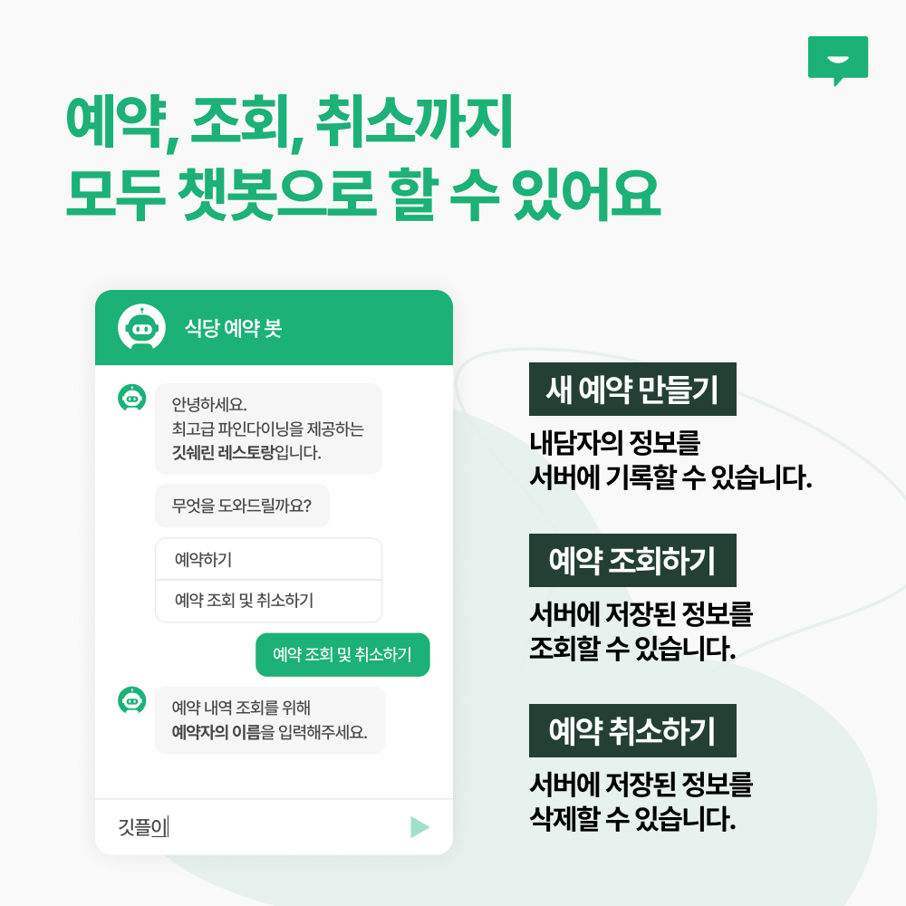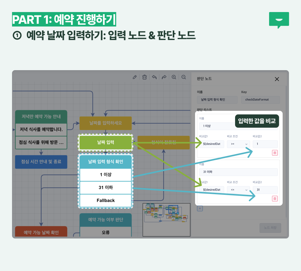 식당 예약 봇의 경우는 1~31 사이의 숫자만 입력하는 판단을 하도록 설정하였지만, 다른 형식의 판단도 가능합니다. 예를 들어 오프라인 행사에 참여한 사람에게만 사전에 비밀번호를 알려준 다음에, 나중에 챗봇으로 접속해 비밀번호를 입력해야만 다음 단계로 진행할 수 있도록 설정할 수 있습니다.