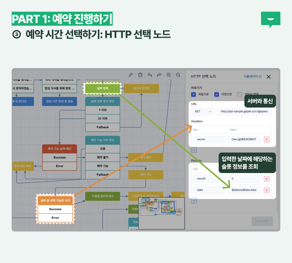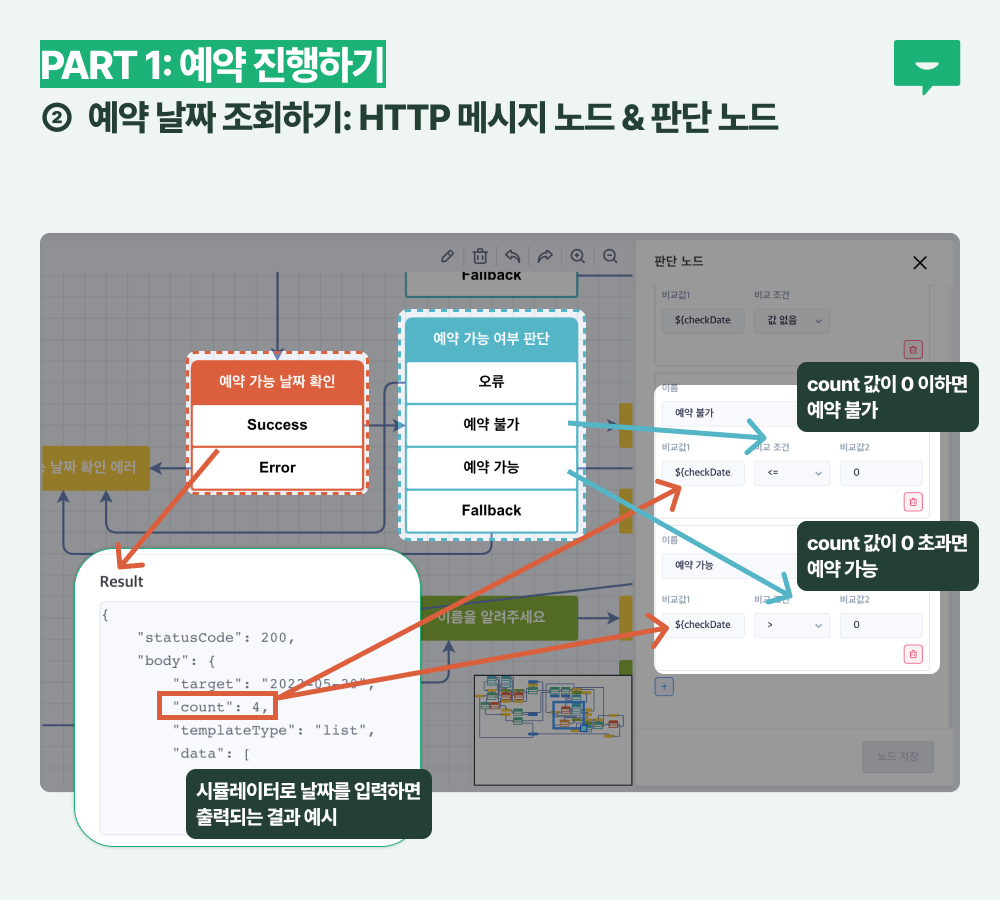 이를 위해 HTTP 메시지 노드와 판단 노드를 활용합니다. HTTP 메시지 노드로 GET 메소드를 활용해 해당 날짜에 예약 가능한 슬롯의 개수를 세어 그 개수가 0이라면 예약 불가를, 1보다 크다면 어떤 시간을 선택할지 안내해 줍니다.