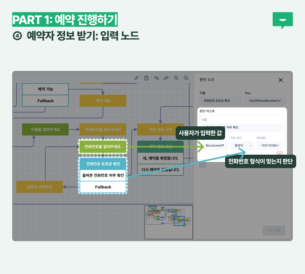 날짜와 시간까지 선택했다면 이제 예약자 정보를 받습니다. 이름과 전화번호를 입력하는 노드를 연결해 주었으며, 위에서 소개한 판단 노드 정규식 팁을 활용해 전화번호 유효성 판단 검증까지 연결해 두었습니다.