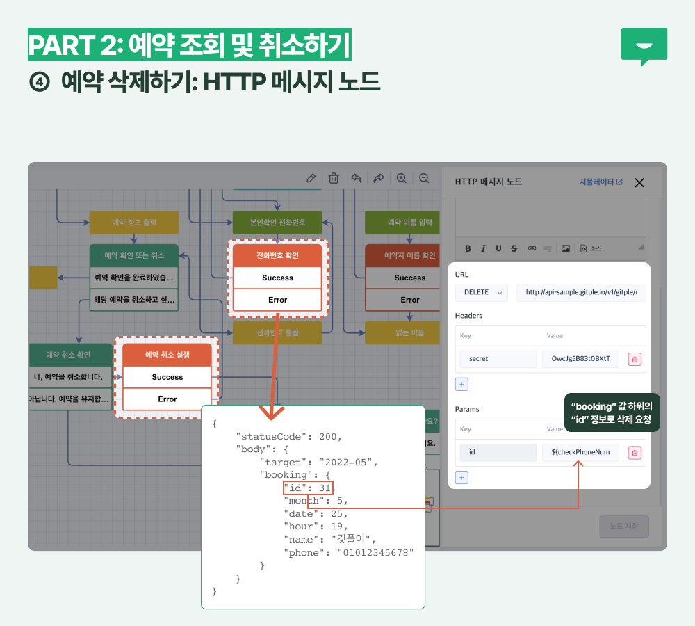 앞의 ② 전화번호 조회하기에서 booking 값을 불러올 때 “id”라는 항목이 있었습니다. 삭제할 때에는 이 id 값을 사용합니다.
