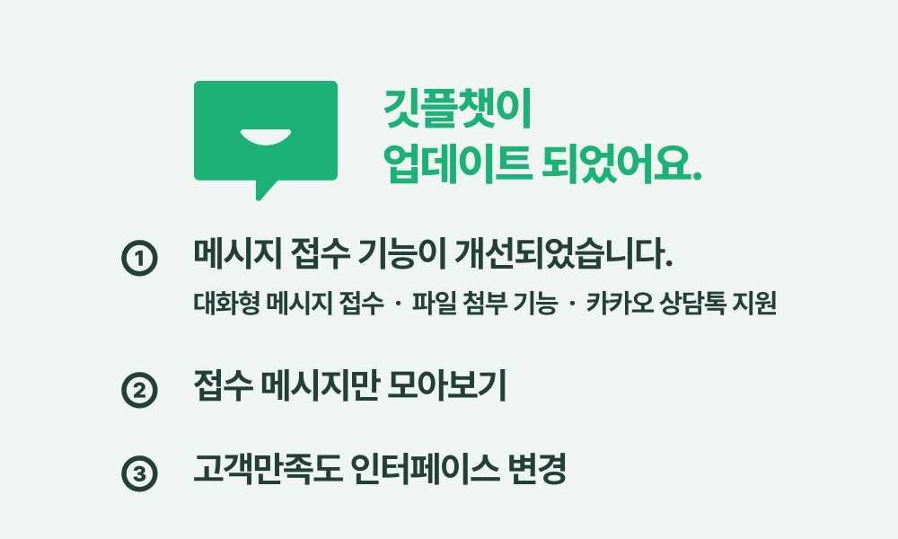안녕하세요,깃플챗 업데이트 사항을 알려드리겠습니다. 이제 카카오 상담톡에서 메시지 접수 기능을 사용할 수 있으며, 메시지를 접수할 때 파일 첨부가 가능합니다. 메시지 접수를 통해 집계한 내용을 워크스페이스에서 한 눈에 모아 볼 수 있습니다. 이외에도 변경된 업데이트 사항을 안내해 드릴게요. 1️⃣