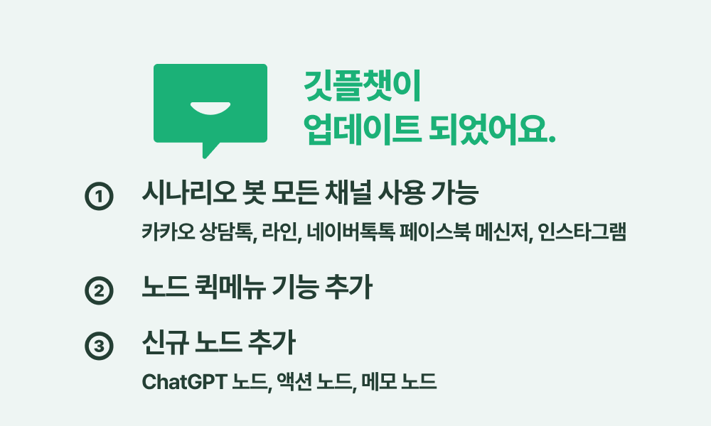 안녕하세요,깃플챗 업데이트 사항을 알려드리겠습니다. 시나리오 봇이 대폭 업그레이드 되었습니다.이제 카카오톡 뿐만 아니라 라인, 네이버톡톡에서도 시나리오 봇을 사용할 수 있습니다. 노드 편집이 용이하도록 퀵 메뉴 버튼이 추가되었습니다. 또한 액션 노드, ChatGPT 노드, 메모 노드가 새롭게 추가되었습니다. 1️⃣ 네이버톡톡, 라인,
